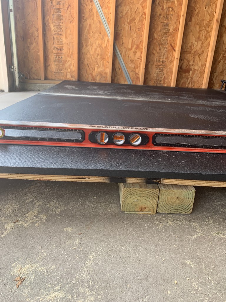 Note that garages are generally sloped downward toward the alley or driveway, so we used wood planks of ascending thickness to even out the platform.