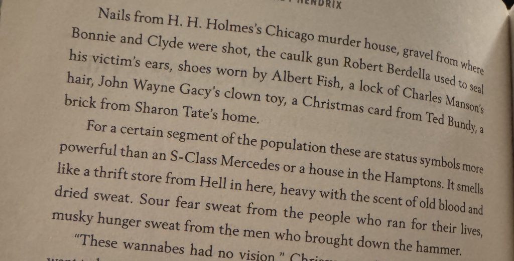 Hendrix also has a knack for making makes things incredibly creepy. I’ve never seen “Silent Night Deadly Night,” and always sort of wrote it off as a stupid slasher, but Hendrix, through Lynette’s memories of the slaughter of her family, transforms the idea of a Santa-themed killer into something truly horrific. Another highlight comes later in the book, when Lynette comes across a sort of serial killer museum: