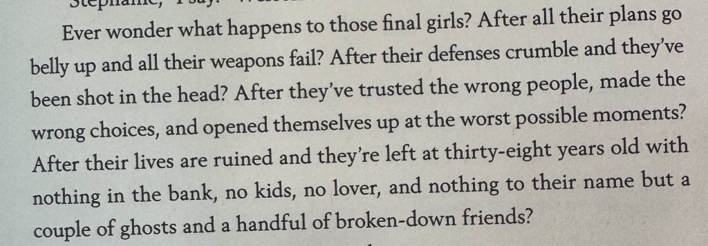 But soon the plot kicks in–a mere 19 pages into the book–when one of the Final Girls is found dead. This sends Lynette into survival mode, but she soon finds that she and all of the other members of the group are also targets of the killer, who seems to know all of the weak spots of the final girls.