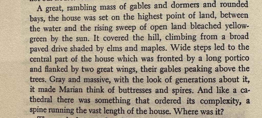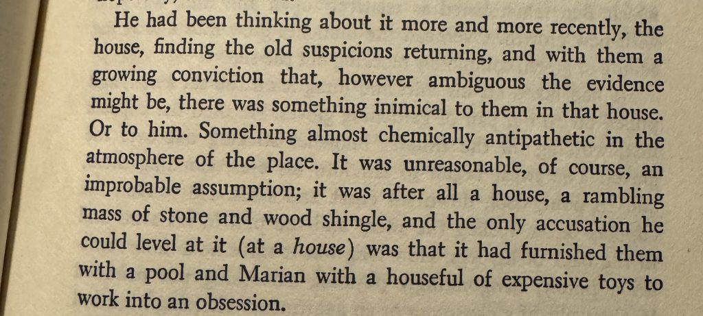 By the end of the book, I began to think of the house, and the fate of the Rolfe family, as a sort of a metaphor for the 1970s wave of “white flight,” or families choosing to move out of the city for what seems like the comforts of the suburbs. David, who was active and playful in the city, is devoid of friends or peers in the echoing old house and soon is just mindlessly consuming junk food while staring at the television. Marian falls prey to materialism, becoming obsessed with the beauty of the house and the treasures–fine china and silver–within. Ben becomes intellectually neutered, striving to complete his Master’s degree but stymied. And all of them–but particularly Aunt Elizabeth–begin to age at an accelerated rate, as if the stasis of country life acts as a magnifying force to the ravages of time. All this is of a piece with the countercultural depiction of suburban life as atomized, anti-intellectual, and materialistic.