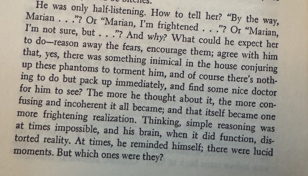 Even by this point, the reader can sense that something is not quite right. But Marasco keeps things on a low boil throughout: the family (accompanied by Ben’s septuagenarian Aunt Elizabeth) doesn’t even move into the house until 77 pages into a 246 page book. By that point, Marian has already developed an unhealthy obsession with the house: