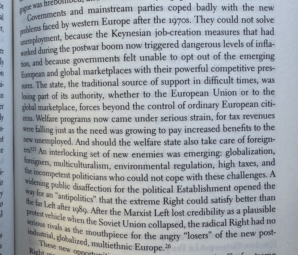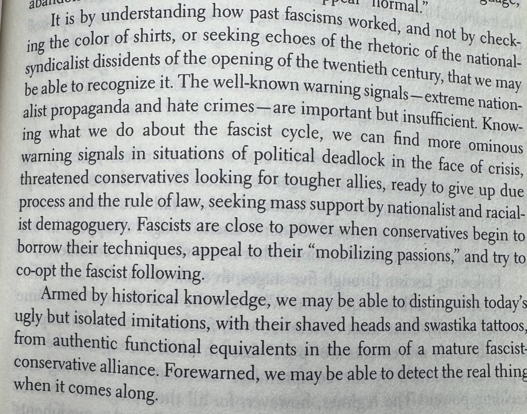 Paxton emphasizes over and over that it was the particular sociopolitical conditions of post World War I Europe that created the conditions for fascism: mass impoverishment, devastation that is almost unimaginable to modern Americans, the absolute decimation of an entire generation of young men, and an inability to absorb the survivors into the workforce.